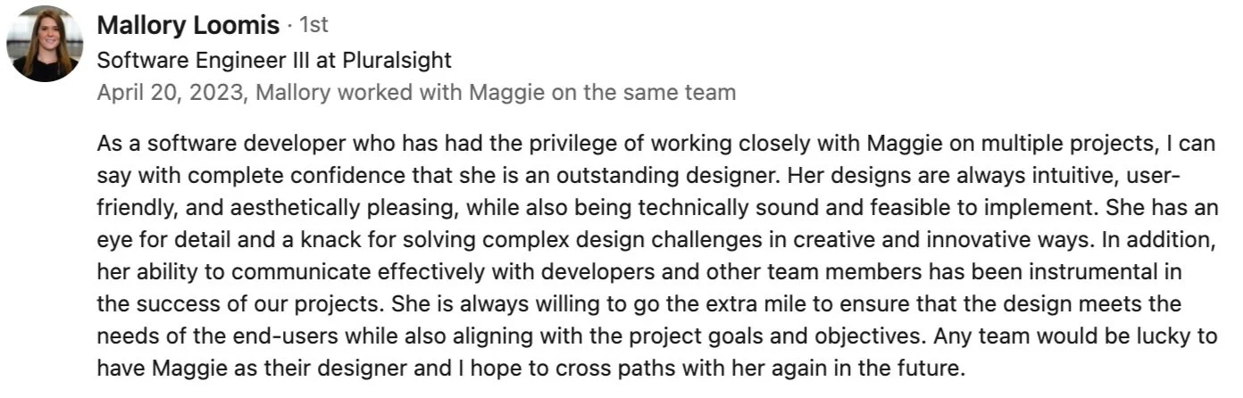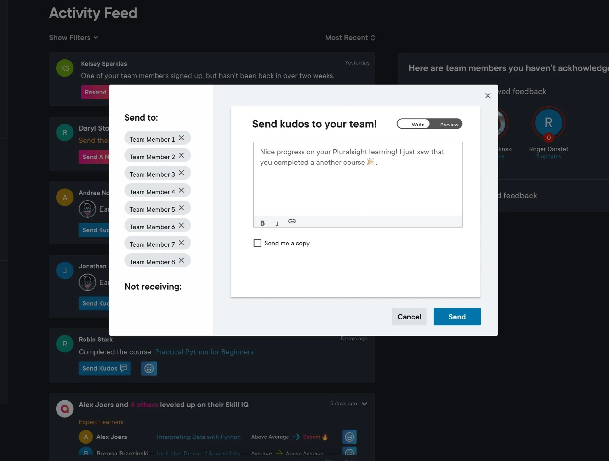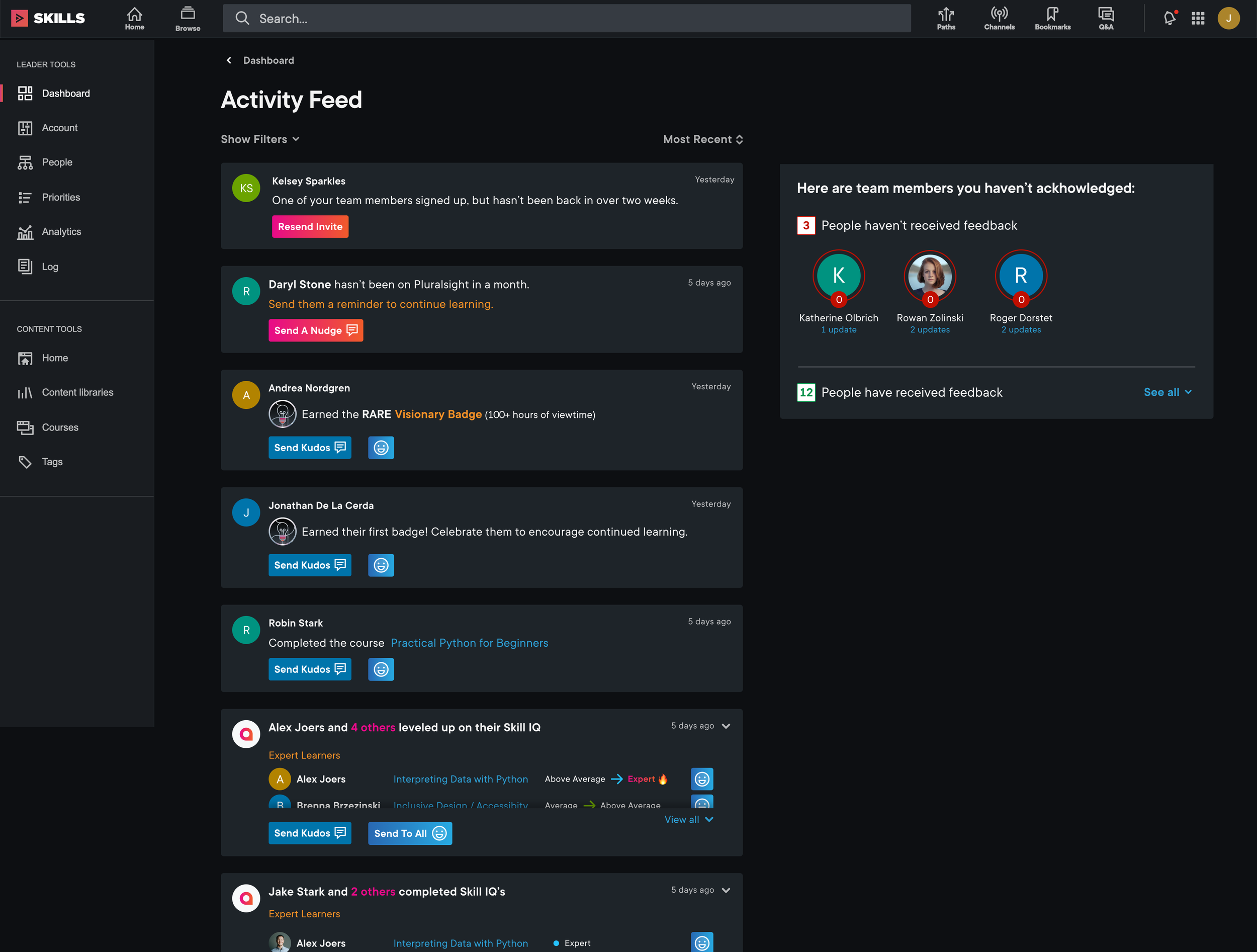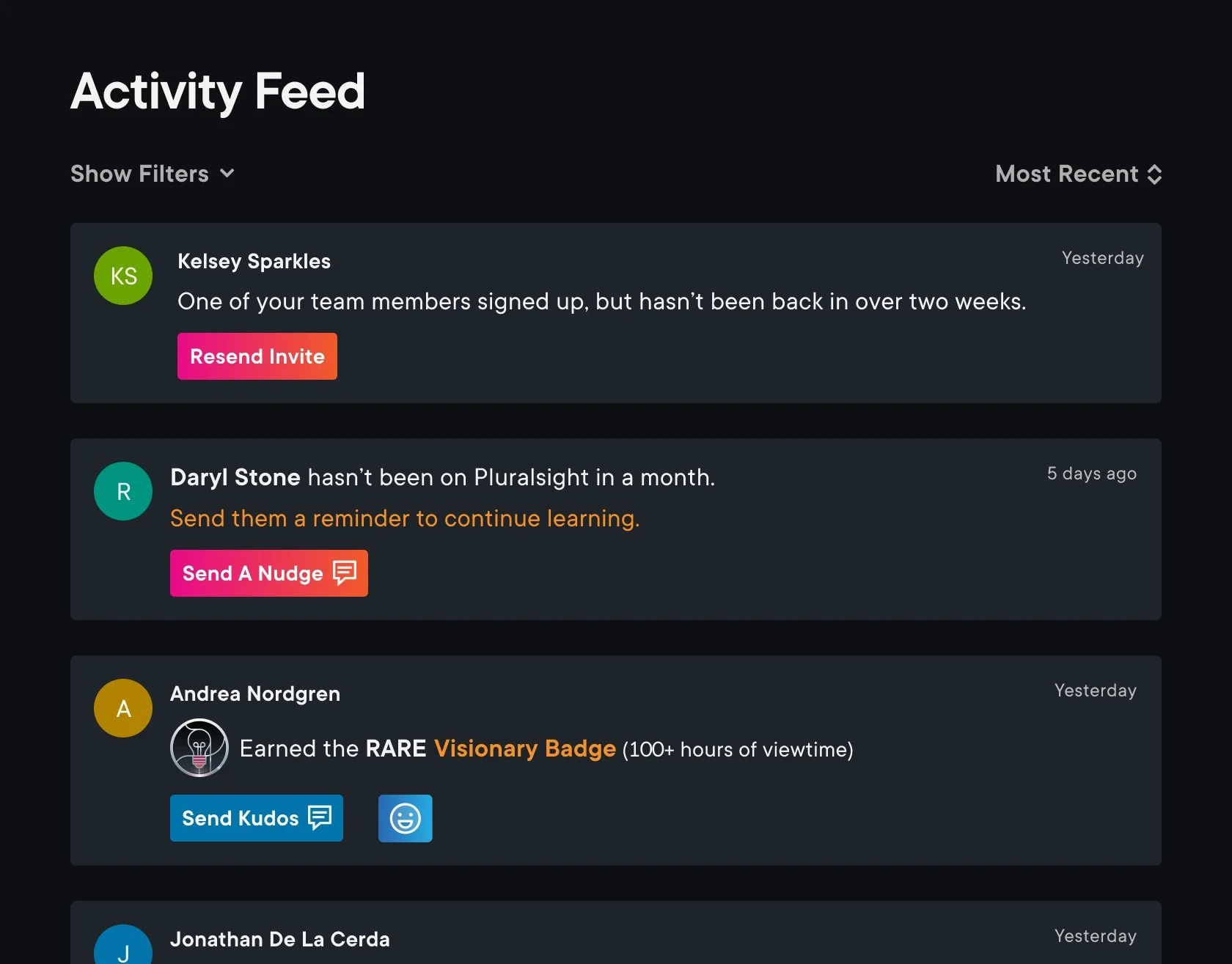 The activity feed was developed in order to solve an experience disconnect between learners and managers in Pluralsight’s product, which was discovered through user testing done by Pluralsight’s research team. Learners were having trouble finding intrinsic motivation in the platform, and managers were struggling to understand their team members’ progress and license usage. My team designed the activity feed in order to give managers visibility into learner updates and to allow them to respond individually or to multiple team members at once. The goal of this is to create greater motivation in the product for learners, by increasing visibility and social engagement within the experience.
