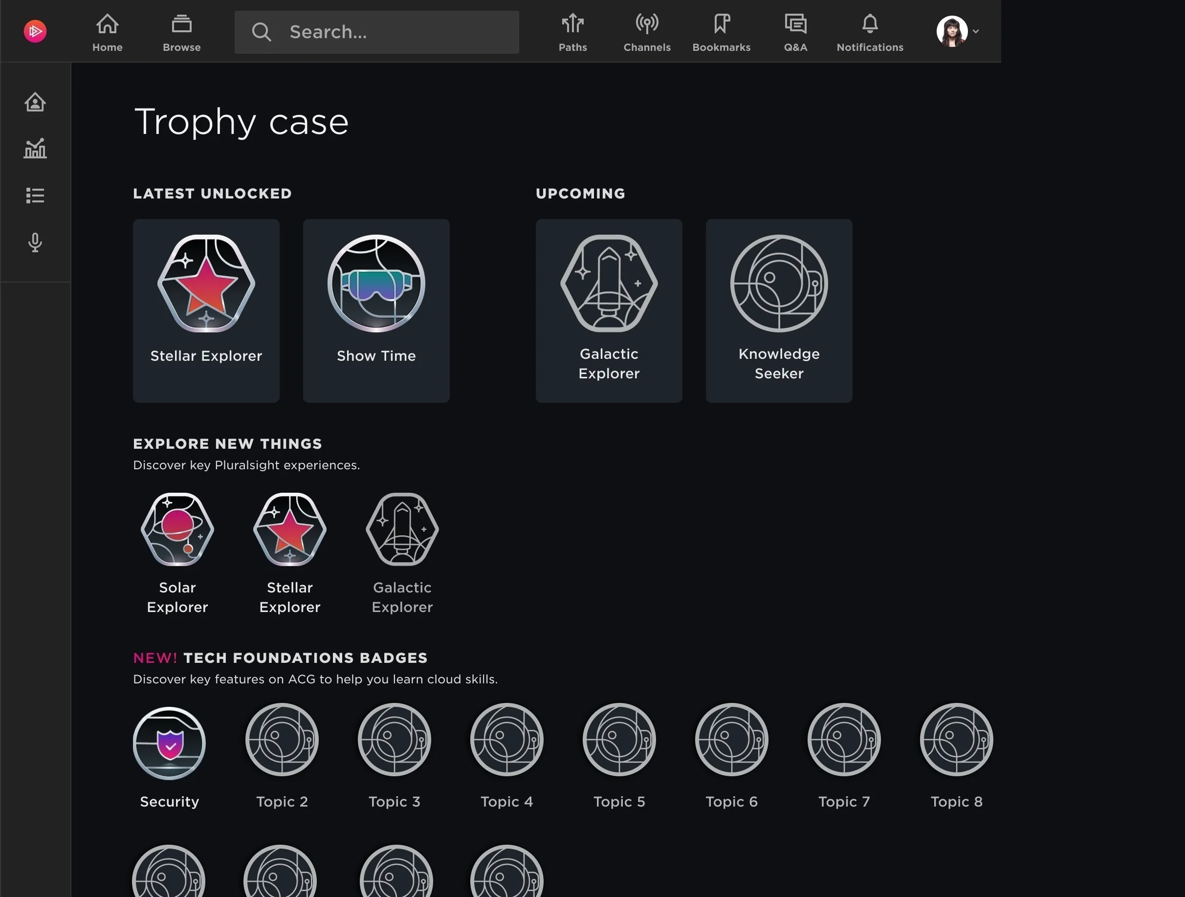 During my time at Pluralsight, I worked as a Gamification and Onboarding designer specializing in creating experiences that welcome and delight users from their first touchpoint through their full adoption of the product. I consulted with different teams in all areas of the product to help boost engagement and introduce game mechanics to push user and business goals (sales, marketing, tech foundations, native, CSM leads, research, home, and more). As part of this work, I paired with our research team to interview current managers using our products as well as new users to audit and enhance our engagement methodologies. These findings were then synthesized and shared internally to support top business initiatives. I also developed a plan to integrate two different game mechanic frameworks when we acquired A Cloud Guru and worked with my developers to launch these updates on a tight timeline (while also updating all of our product assets to a new design system).